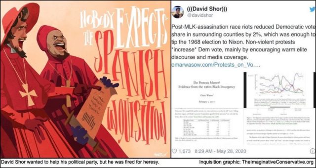 A recent example is that of David Shor, a data analyst for Democratic political candidates. He was a loyal Democrat. To support his group, he cited a Princeton University study that showed race riots hurt Democratic candidates but peaceful protest helps them.